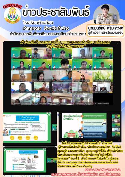 วันที่ 20 พฤษภาคม 2568 นายมนรักษ์ ศรีมหาวงค์ ผู้อำนวยการโรงเรียนบ้านอ้อน พร้อมด้วยนางสาวนริศรา กัลปสันติ ครูแกนนำ และนางสาวศิริพร สุทธนะ ครูรัก(ษ์)ถิ่น เข้าร่วมรับฟังการประชุมชี้แจงแนวทางการดำเนินงานโครงการ“ครูรัก(ษ์)ถิ่น รักคุณธรรม” ระยะที่ 2 เพื่อสร้างความเข้าใจร่วมกันในเป้าหมาย กิจกรรม และกระบวนการดำเนินงานตลอดระยะเวลาของโครงการ