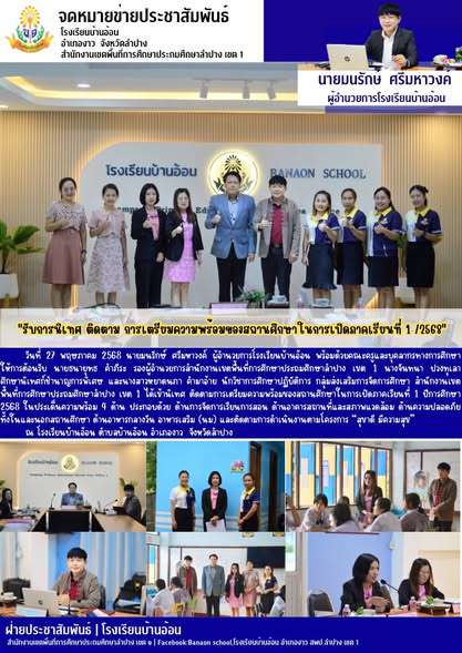 วันที่ 27 พฤษภาคม 2568 นายมนรักษ์ ศรีมหาวงค์ ผู้อำนวยการโรงเรียนบ้านอ้อน พร้อมด้วยคณะครูและบุคลากรทางการศึกษาให้การต้อนรับ นายธนายุทธ คำภีระ รองผู้อำนวยการสำนักงานเขตพื้นที่การศึกษาประถมศึกษาลำปาง เขต 1 นางจันทนา ปวงทุเลา ศึกษานิเทศก์ชำนาญการพิเศษ และนางสาวหยาดนภา คำมาอ้าย นักวิชาการศึกษาปฏิบัติการ กลุ่มส่งเสริมการจัดการศึกษา สำนักงานเขตพื้นที่การศึกษาประถมศึกษาลำปาง เขต 1 ได้เข้านิเทศ ติดตามการเตรียมความพร้อมของสถานศึกษาในการเปิดภาคเรียนที่ 1 ปีการศึกษา 2568 ในประเด็นความพร้อม 4 ด้าน ประกอบด้วย ด้านการจัดการเรียนการสอน ด้านอาคารสถานที่และสภาพแวดล้อม ด้านความปลอดภัยทั้งในและนอกสถานศึกษา ด้านอาหารกลางวัน อาหารเสริม (นม) และติดตามการดำเนินงานตามโครงการ “สุขาดี มีความสุข”