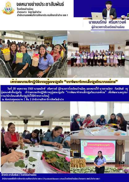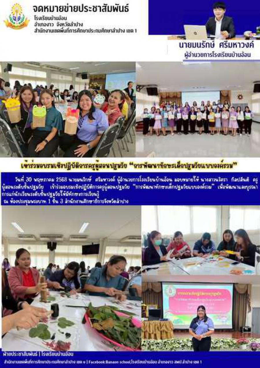 วันที่ 30 พฤษภาคม 2568 นายมนรักษ์ ศรีมหาวงค์ ผู้อำนวยการโรงเรียนบ้านอ้อน มอบหมายให้ นางสาวนริศรา กัลปสันติ ครูผู้สอนระดับชั้นปฐมวัย เข้าร่วมอบรมเชิงปฏิบัติการครูผู้สอนปฐมวัย “การพัฒนาทักษะเด็กปฐมวัยแบบองค์รวม” เพื่อพัฒนาและบูรณาการแก่นักเรียนระดับชั้นปฐมวัยให้มีทักษะการเรียนรู้