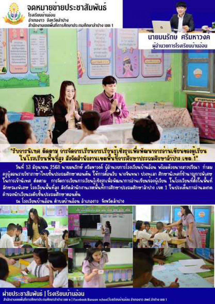 วันที่ 13 มิถุนายน 2568 นายมนรักษ์ ศรีมหาวงค์ ผู้อำนวยการโรงเรียนบ้านอ้อน พร้อมด้วยนางสาวปวีณา ก๋าสม ครูผู้สอนรายวิชาภาษาไทยชั้นประถมศึกษาตอนต้น ให้การต้อนรับ นางจันทนา ปวงทุเลา ศึกษานิเทศก์ชำนาญการพิเศษ ในการเข้านิเทศ ติดตาม การจัดการเรียนการเรียนรู้เชิงรุกเพื่อพัฒนาการอ่านเขียนของผู้เรียน ในโรงเรียนที่ตั้งในพื้นที่ลักษณะพิเศษ โรงเรียนพื้นที่สูง สังกัดสำนักงานเขตพื้นที่การศึกษาประถมศึกษาลำปาง เขต 1 ในประเด็นการอ่านสะกดคำของนักเรียนระดับชั้นประถมศึกษาตอนต้น
