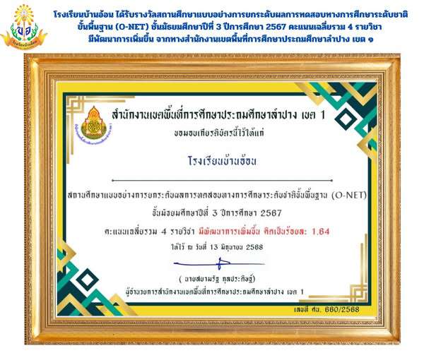 ได้รับรางวัลสถานศึกษาแบบอย่างการยกระดับผลการทดสอบทางการศึกษาระดับชาติขั้นพื้นฐาน (O-NET) ชั้นมัธยมศึกษาปีที่ 3 ปีการศึกษา 2567 คะแนนเฉลี่ยรวม 4 รายวิชา มีพัฒนาการสูงขึ้นอย่างต่อเนื่อง (3 ปี)