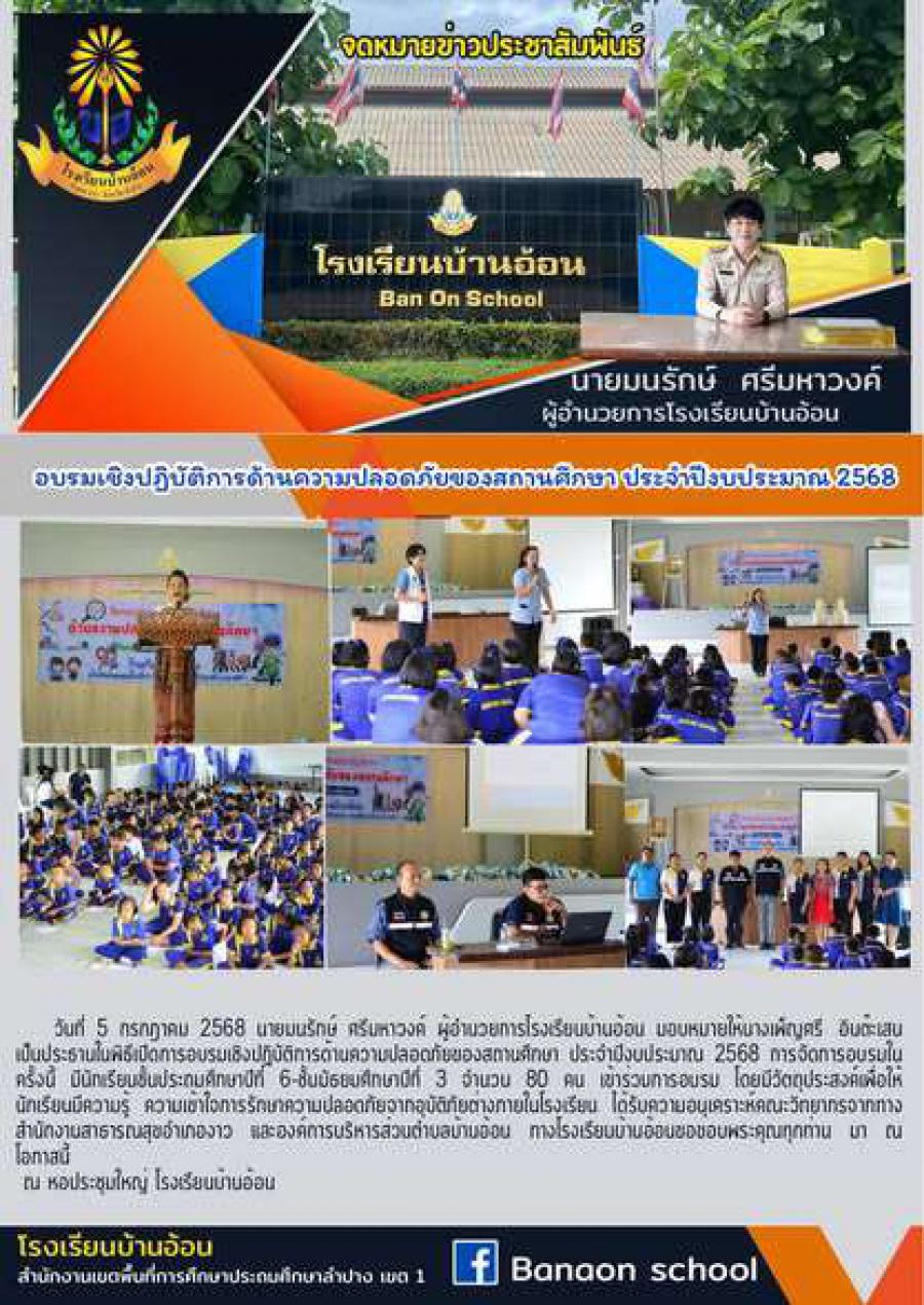วันที่ 5 กรกฎาคม 2568 นายมนรักษ์ ศรีมหาวงค์ ผู้อำนวยการโรงเรียนบ้านอ้อน มอบหมายให้นางเพ็ญศรี อินต๊ะเสน เป็นประธานในพิธีเปิดการอบรมเชิงปฏิบัติการด้านความปลอดภัยของสถานศึกษา ประจำปีงบประมาณ 2568 การจัดการอบรมในครั้งนี้ มีนักเรียนชั้นประถมศึกษาปีที่ 6-ชั้นมัธยมศึกษาปีที่ 3 จำนวน 80 คน เข้าร่วมการอบรม โดยมีวัตถุประสงค์เพื่อให้นักเรียนมีความรู้ ความเข้าใจการรักษาความปลอดภัยจากอุบัติภัยต่างภายในโรงเรียน ได้รับความอนุเคราะห์คณะวิทยากรจากทาง สำนักงานสาธารณสุขอำเภองาว และองค์การบริหารส่วนตำบลบ้านอ้อน ทางโรงเรียนบ้านอ้อนขอขอบพระคุณทุกท่าน มา ณ โอกาสนี้