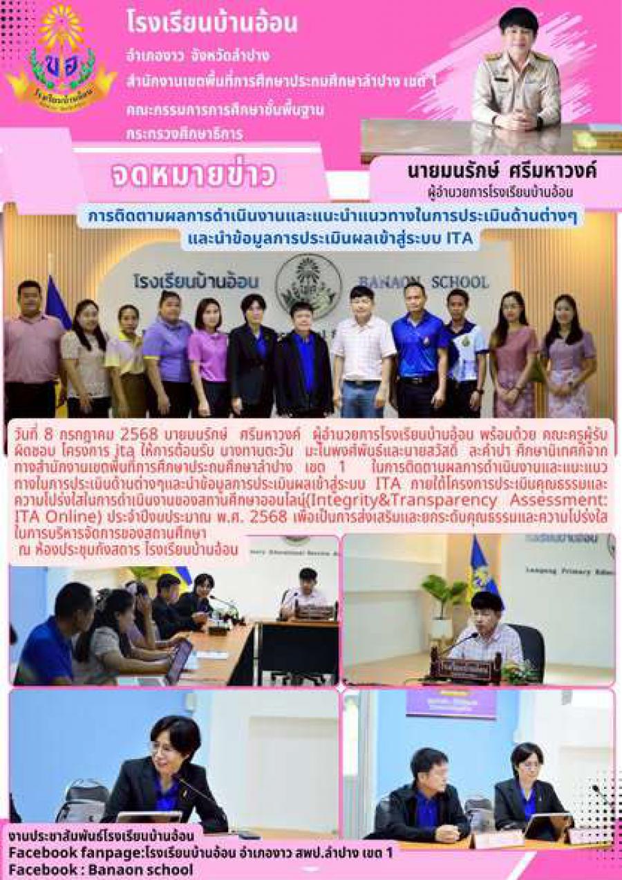 วันที่ 8 กรกฎาคม 2568 นายมนรักษ์ ศรีมหาวงค์ ผู้อำนวยการโรงเรียนบ้านอ้อน พร้อมด้วย คณะครูผู้รับผิดชอบ โครงการ ita ให้การต้อนรับ นางทานตะวัน มะโนพงศ์พันธ์และนายสวัสดิ์ ละคำปา ศึกษานิเทศก์จากทางสำนักงานเขตพื้นที่การศึกษาประถมศึกษาลำปาง เขต 1 ในการติดตามผลการดำเนินงานและแนะแนวทางในการประเมินด้านต่างๆและนำข้อมูลการประเมินผลเข้าสู่ระบบ ITA ภายใต้โครงการประเมินคุณธรรมและความโปร่งใสในการดำเนินงานของสถานศึกษาออนไลน์(Integrity&Transparency Assessment: ITA Online) ประจำปีงบประมาณ พ.ศ. 2568 เพื่อเป็นการส่งเสริมและยกระดับคุณธรรมและความโปร่งใสในการบริหารจัดการของสถานศึกษา