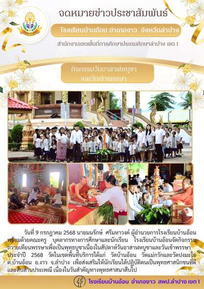 วันที่ 9 กรกฎาคม 2568 นายมนรักษ์ ศรีมหาวงค์ ผู้อำนวยการโรงเรียนบ้านอ้อน พร้อมด้วยคณะครู บุคลากรทางการศึกษาและนักเรียน โรงเรียนบ้านอ้อนจัดกิจกรรมถวายเทียนพรรษาเพื่อเป็นพุทธบูชาเนื่องในสัปดาห์วันอาสาฬหบูชาและวันเข้าพรรษา ประจำปี 2568 วัดในเขตพื้นที่บริการได้แก่ วัดบ้านอ้อน วัดแม่กวักและวัดปงมะโอ ต.บ้านอ้อน อ.งาว จ.ลำปาง เพื่อส่งเสริมให้นักเรียนได้ปฏิบัติตนเป็นพุทธศาสนิกชนที่ดีและสืบสานประเพณี เนื่องในวันสำคัญทางพุทธศาสนาสืบไป