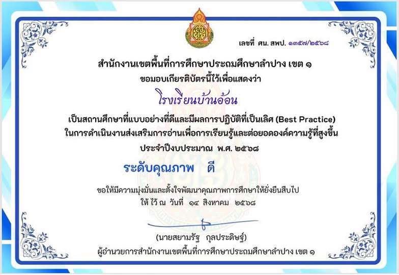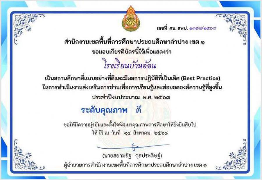 ได้รับรางวัลสถานศึกษาแบบอย่างที่ดีและมีผลการปฏิบัติที่เป็นเลิศ (Best Practice)ในการดำเนินงานส่งเสริมการอ่านเพื่อการเรียนรู้และต่อยอดองค์ความรู้ที่สูงขึ้น ประจำปีงบประมาณ พ.ศ. ๒๕๖๘ อยู่ในระดับคุณภาพ #ดี