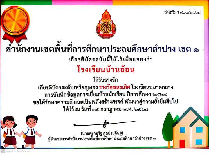 โรงเรียนบ้านอ้อนได้รับรางวัลเกียรติบัตรเหรียญทอง #รางวัลชนะเลิศ โรงเรียนขนาดกลาง การบันทึกข้อมูลการเยี่ยมบ้านนักเรียน ปีการศึกษา ๒๕๖๘