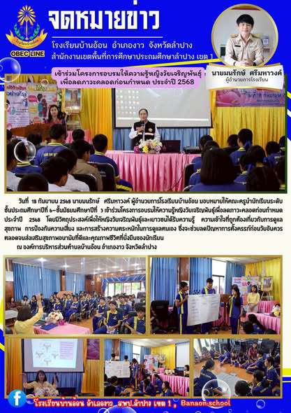 วันที่ 18 กันยายน 2568 นายมนรักษ์ ศรีมหาวงค์ ผู้อำนวยการโรงเรียนบ้านอ้อน มอบหมายให้คณะครูนำนักเรียนระดับชั้นประถมศึกษาปีที่ 6-ชั้นมัธยมศึกษาปีที่ 3 เข้าร่วมโครงการอบรมให้ความรู้หญิงวัยเจริญพันธุ์เพื่อลดภาวะคลอดก่อนกำหนด ประจำปี 2568 โดยมีวัตถุประสงค์เพื่อให้หญิงวัยเจริญพันธุ์และเยาวชนได้รับความรู้ ความเข้าใจที่ถูกต้องเกี่ยวกับการดูแลสุขภาพ การป้องกันความเสี่ยง และการสร้างความตระหนักในการดูแลตนเอง ซึ่งจะช่วยลดปัญหาการตั้งครรภ์ก่อนวัยอันควร ตลอดจนส่งเสริมสุขภาพอนามัยที่ดีและคุณภาพชีวิตที่ยั่งยืนของนักเรียน