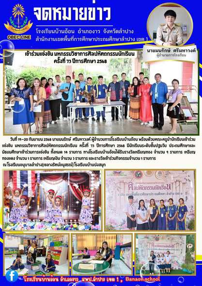 วันที่ 19-20 กันยายน 2568 นายมนรักษ์ ศรีมหาวงค์ ผู้อำนวยการโรงเรียนบ้านอ้อน พร้อมด้วยคณะครูนำนักเรียนเข้าร่วมแข่งขัน มหกรรมวิชาการศิลปหัตถกรรมนักเรียน ครั้งที่ 73 ปีการศึกษา 2568 มีนักเรียนระดับชั้นปฐมวัย ประถมศึกษาและมัธยมศึกษาเข้าร่วมการแข่งขัน ทั้งหมด 14 รายการ ทางโรงเรียนบ้านอ้อนได้รับรางวัล