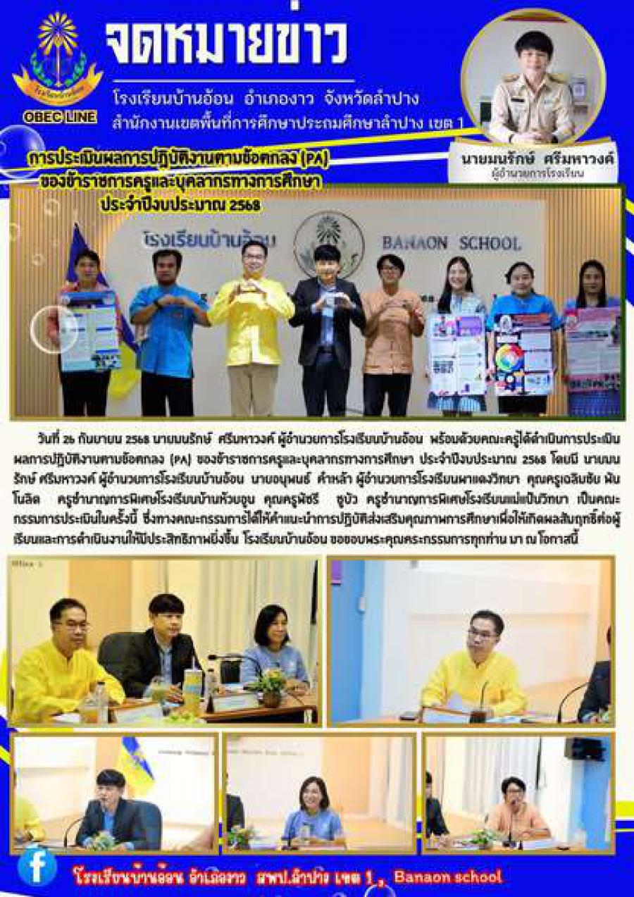 วันที่ 26 กันยายน 2568 นายมนรักษ์ ศรีมหาวงค์ ผู้อำนวยการโรงเรียนบ้านอ้อน พร้อมด้วยคณะครูได้ดำเนินการประเมินผลการปฏิบัติงานตามข้อตกลง (PA) ของข้าราชการครูและบุคลากรทางการศึกษา ประจำปีงบประมาณ 2568 โดยมี นายมนรักษ์ ศรีมหาวงค์ ผู้อำนวยการโรงเรียนบ้านอ้อน นายอนุพนธ์ คำหล้า ผู้อำนวยการโรงเรียนผาแดงวิทยา คุณครูเฉลิมชัย พันโนลิด ครูชำนาญการพิเศษโรงเรียนบ้านห้วยอูน คุณครูพัชรี ชูบัว ครูชำนาญการพิเศษโรงเรียนแม่แป้นวิทยา เป็นคณะกรรมการประเมินในครั้งนี้ ซึ่งทางคณะกรรมการได้ให้คำแนะนำการปฏิบัติส่งเสริมคุณภาพการศึกษาเพื่อให้เกิดผลสัมฤทธิ์ต่อผู้เรียนและการดำเนินงานให้มีประสิทธิภาพยิ่งขึ้น โรงเรียนบ้านอ้อน ขอขอบพระคุณคณะกรรมการทุกท่าน มา ณ โอกาสนี้