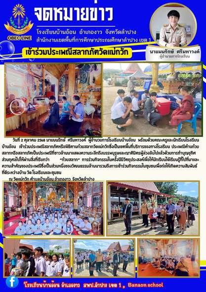 วันที่ 2 ตุลาคม 2568 นายมนรักษ์ ศรีมหาวงค์ ผู้อำนวยการโรงเรียนบ้านอ้อน พร้อมด้วยคณะครูและนักเรียนโรงเรียนบ้านอ้อน เข้าร่วมประเพณีสลากภัตหรือพิธีตานก๋วยสลากวัดแม่กวักซึ่งเป็นเขตพื้นที่บริการของทางโรงเรียน ประเพณีต๋านก๋วยสลากหรือสลากภัตเป็นประเพณีที่ชาวล้านนาแสดงความระลึกถึงบรรพบุรุษและญาติมิตรผู้ล่วงลับไปแล้วด้วยการทำบุญอุทิศส่วนกุศลไปให้ผ่านสิ่งที่เรียกว่า “ก๋วยสลาก” การร่วมกิจกรรมในครั้งนีิมีวัตถุประสงค์เพื่อให้นักเรียนได้เรียนรู้ที่ไปที่มาและความสำคัญของประเพณีซึ่งเป็นส่วนหนึ่งของวัฒนธรรมล้านนารวมถึงการเข้าร่วมกิจกรรมในชุมชนเพื่อก่อให้เกิดความสัมพันธ์ที่ดีระหว่างบ้าน วัด โรงเรียนและชุมชน