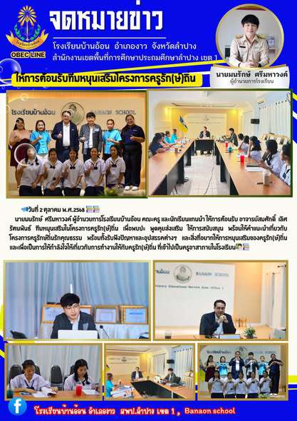นายมนรักษ์ ศรีมหาวงค์ ผู้อำนวยการโรงเรียนบ้านอ้อน คณะครู และนักเรียนแกนนำ ให้การต้อนรับ อาจารย์สมศักดิ์ เลิศรัตนพันธ์ ทีมหนุนเสริมในโครงการครูรัก(ษ์)ถิ่น เพื่อพบปะ พูดคุยส่งเสริม ให้การสนับสนุน พร้อมให้คำแนะนำเกี่ยวกับโครงการครูรักษ์ถิ่นรักคุณธรรม พร้อมทั้งรับฟังปัญหาและอุปสรรคต่างๆ และสิ่งที่อยากให้การหนุนเสริมของครูรัก(ษ์)ถิ่น และเพื่อเป็นการให้กำลังใจให้เกี่ยวกับการทำงานให้กับครูรัก(ษ์)ถิ่น ที่เข้าไปเป็นครูอาสาภายในโรงเรียน