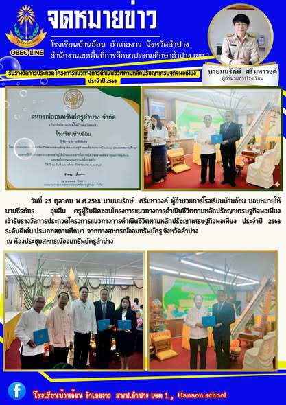 วันที่ 25 ตุลาคม พ.ศ.2568 นายมนรักษ์ ศรีมหาวงค์ ผู้อำนวยการโรงเรียนบ้านอ้อน มอบหมายให้ นายธีรภัทร อุ่นสืบ ครูผู้รับผิดชอบโครงการแนวทางการดำเนินชีวิตตามหลักปรัชญาเศรษฐกิจพอเพียง เข้ารับรางวัลการประกวดโครงการแนวทางการดำเนินชีวิตตามหลักปรัชญาเศรษฐกิจพอเพียง ประจำปี 2568 ระดับดีเด่น ประเภทสถานศึกษา จากทางสหกรณ์ออมทรัพย์ครู จังหวัดลำปาง