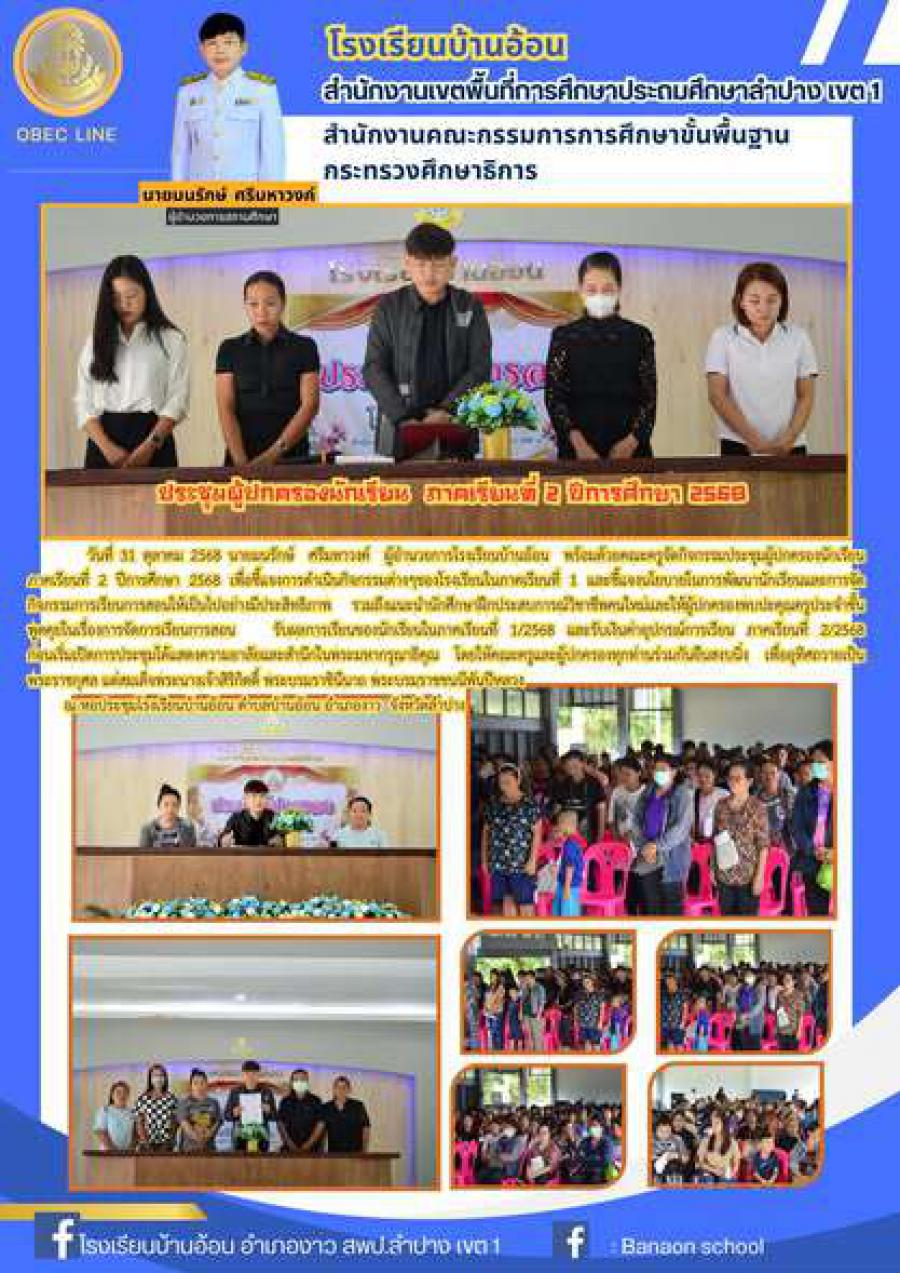 วันที่ 31 ตุลาคม 2568 นายมนรักษ์ ศรีมหาวงค์ ผู้อำนวยการโรงเรียนบ้านอ้อน พร้อมด้วยคณะครูจัดกิจกรรมประชุมผู้ปกครองนักเรียน ภาคเรียนที่ 2 ปีการศึกษา 2568 เพื่อชี้แจงการดำเนินกิจกรรมต่างๆของโรงเรียนในภาคเรียนที่ 1 และชี้แจงนโยบายในการพัฒนานักเรียนและการจัดกิจกรรมการเรียนการสอนให้เป็นไปอย่างมีประสิทธิภาพ รวมถึงแนะนำนักศึกษาฝึกประสบการณ์วิชาชีพคนใหม่และให้ผู้ปกครองพบปะคุณครูประจำชั้นพูดคุยในเรื่องการจัดการเรียนการสอน รับผลการเรียนของนักเรียนในภาคเรียนที่ 1/2568 และรับเงินค่าอุปกรณ์การเรียน ภาคเรียนที่ 2/2568 ก่อนเริ่มเปิดการประชุมได้แสดงความอาลัยและสำนึกในพระมหากรุณาธิคุณ โดยให้คณะครูและผู้ปกครองทุกท่านร่วมกันยืนสงบนิ่ง เพื่ออุทิศถวายเป็น พระราชกุศล แด่สมเด็จพระนางเจ้าสิริกิตติ์ พระบรมราชินีนาถ พระบรมราชชนนีพันปีหลวง