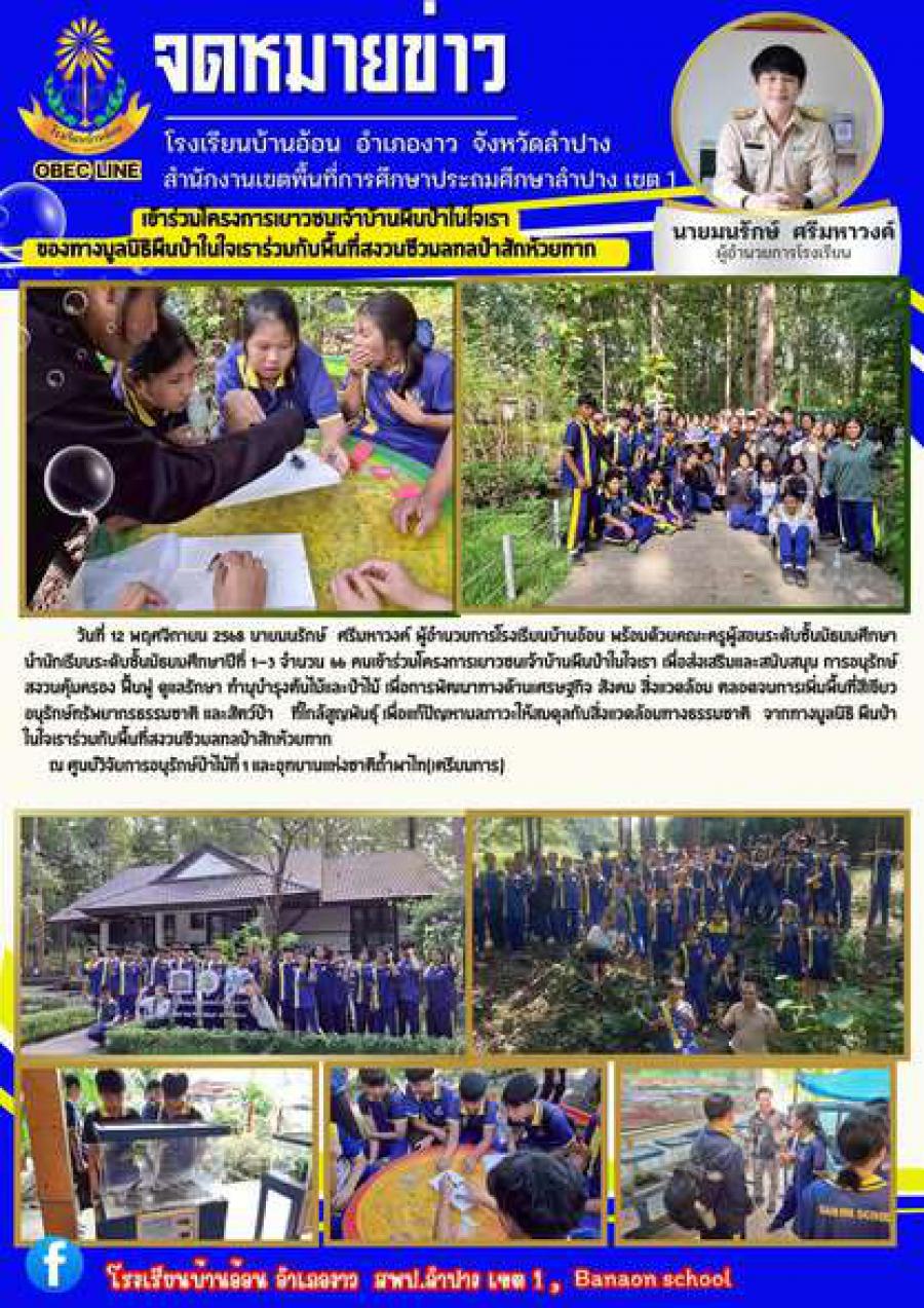 วันที่ 12 พฤศจิกายน 2568 นายมนรักษ์ ศรีมหาวงค์ ผู้อำนวยการโรงเรียนบ้านอ้อน พร้อมด้วยคณะครูผู้สอนระดับชั้นมัธยมศึกษา นำนักเรียนระดับชั้นมัธยมศึกษาปีที่ 1-3 จำนวน 66 คนเข้าร่วมโครงการเยาวชนเจ้าบ้านผืนป่าในใจเรา เพื่อส่งเสริมและสนับสนุน การอนุรักษ์ สงวนคุ้มครอง ฟื้นฟู ดูแลรักษา ทำนุบำรุงต้นไม้และป่าไม้ เพื่อการพัฒนาทางด้านเศรษฐกิจ สังคม สิ่งแวดล้อม ตลอดจนการเพิ่มพื้นที่สีเขียวอนุรักษ์ทรัพยากรธรรมชาติ และสัตว์ป่า ที่ใกล้สูญพันธุ์ เพื่อแก้ปัญหามลภาวะให้สมดุลกับสิ่งแวดล้อมทางธรรมชาติ จากทางมูลนิธิ ผืนป่าในใจเราร่วมกับพื้นที่สงวนชีวมลฑลป่าสักห้วยทาก