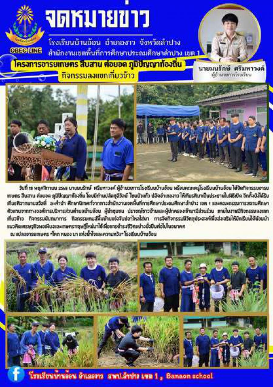 วันที่ 18 พฤศจิกายน 2568 นายมนรักษ์ ศรีมหาวงค์ ผู้อำนวยการโรงเรียนบ้านอ้อน พร้อมคณะครูโรงเรียนบ้านอ้อน ได้จัดกิจกรรมอารยเกษตร สืบสาน ต่อยอด ภูมิปัญญาท้องถิ่น โดยมีท่านปลัดชุลีวัลย์ ไชยบัวแก้ว ปลัดอำเภองาว ให้เกียรติมาเป็นประธานในพิธีเปิด อีกทั้งยังได้รับเกียรติจากนายสวัสดิ์ ละคำปา ศึกษานิเทศก์จากทางสำนักงานเขตพื้นที่การศึกษาประถมศึกษาลำปาง เขต 1 และคณะกรรมการสถานศึกษา ตัวแทนจากทางองค์การบริหารส่วนตำบลบ้านอ้อน ผู้นำชุมชน ปราชญ์ชาวบ้านและผู้ปกครองเข้ามามีส่วนร่วม ภายในงานมีกิจกรรมลงแขกเกี่ยวข้าว กิจกรรมนันทนาการ กิจกรรมเกมส์พื้นบ้านแข่งจับปลาไหลใส่นา การจัดกิจกรรมมีวัตถุประสงค์เพืื่อส่งเสริมให้นักเรียนได้น้อมนำแนวคิดเศรษฐกิจพอเพียงและเกษตรทฤษฎีใหม่มาใช้เพื่อการดำรงชีวิตอย่างยั่งยืนต่อไปในอนาคต