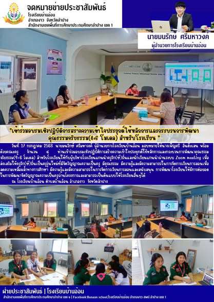 วันที่ 17 กรกฎาคม 2568 นายมนรักษ์ ศรีมหาวงค์ ผู้อำนวยการโรงเรียนบ้านอ้อน มอบหมายให้นางเพ็ญศรี อินต๊ะเสน พร้อมด้วยคณะครู จำนวน ๔ ท่านเข้าร่วมอบรมเชิงปฏิบัติการสร้างความเข้าใจประยุกต์ใช้หลักการและกระบวนการพัฒนาคุณธรรมจริยธรรม(4+6 โมเดล) สำหรับโรงเรียนให้กับผู้บริหารโรงเรียนแกนนำครูรัก(ษ์)ถิ่นและนักเรียนแกนนำผ่านระบบ Zoom meeting เพื่อ ส่งเสริมให้ครูรัก(ษ์)ถิ่นเป็นครูรุ่นใหม่ที่มีจิตวิญญาณความเป็นครู มีคุณธรรม มีความรู้และมีความสามารถในการจัดการเรียนการสอนเพื่อลดความเหลื่อมล้ำทางการศึกษา มีความรู้และมีความสามารถในการจัดการเรียนการสอนและสนับสนุน การพัฒนาโรงเรียนให้มีการต่อยอด ในการพัฒนาจิตวิญญาณความเป็นครูผ่านโครงการและสามารถเป็นต้นแบบให้โรงเรียนอื่นๆได้