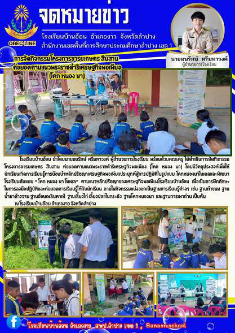 โรงเรียนบ้านอ้อน นำโดยนายมนรักษ์ ศรีมหาวงค์ ผู้อำนวยการโรงเรียน พร้อมด้วยคณะครู ได้ดำเนินการจัดกิจกรรมโครงการอารยเกษตร สืบสาน ต่อยอดตามแนวพระราชดำริเศรษฐกิจพอเพียง (โคก หนอง นา) โดยมีวัตถุประสงค์เพื่อให้นักเรียนเกิดการเรียนรู้การน้อมนำหลักปรัชญาเศรษฐกิจพอเพียงประยุกต์สู่การปฏิบัติในรูปแบบ โคกหนองนาโมเดลและพัฒนาโรงเรียนต้นแบบ “ โคก หนอง นา โมเดล” ตามแนวหลักปรัชญาของเศรษฐกิจพอเพียงโรงเรียนบ้านอ้อน เพื่อเป็นการฝึกทักษะในการลงมือปฏิบัติและต่อยอดการเรียนรู้ให้กับนักเรียน ภายในกิจกรรมแบ่งออกเป็นฐานการเรียนรู้ต่างๆ เช่น ฐานทำขนม ฐานน้ำยาล้างจาน ฐานอ้อนเพลินคาเฟ่ ฐานเลี้ยงไก่ เลี้ยงปลาในกระชัง ฐานโคกหนองนา และฐานการเผาถ่าน เป็นต้น
